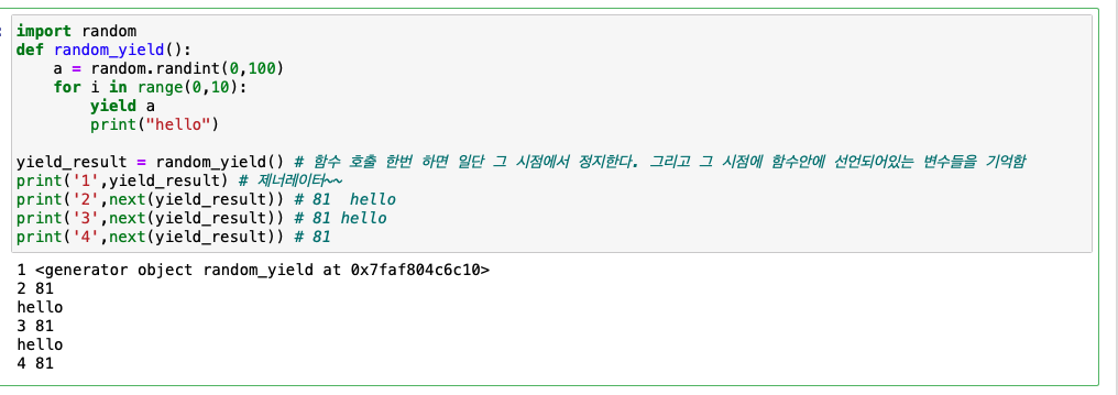 즉 yield를 사용하면 원하는 값을 리턴하며, 실행 흐름을 일시 정지하여 함수를 재활용할 수 있는 상태로 만들 수 있다