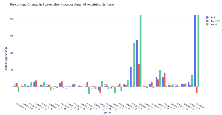 어떠한 class weight들을 적용시키지 않고 학습한 모델과 비교하여서 INS 방법을 적용하였을때에 모델의 f0.5 score가 2.5퍼센트 개선된 것을 알 수 있는 결과다. 이 결과가 개선된 것이 majority class에서 일어났는지, minority class에서 일어난 결과인지 비교하기 위해서 INS방법을 적용 시킨 후 percent change를 각 각 클래스 별로 나타낸 결과이다.