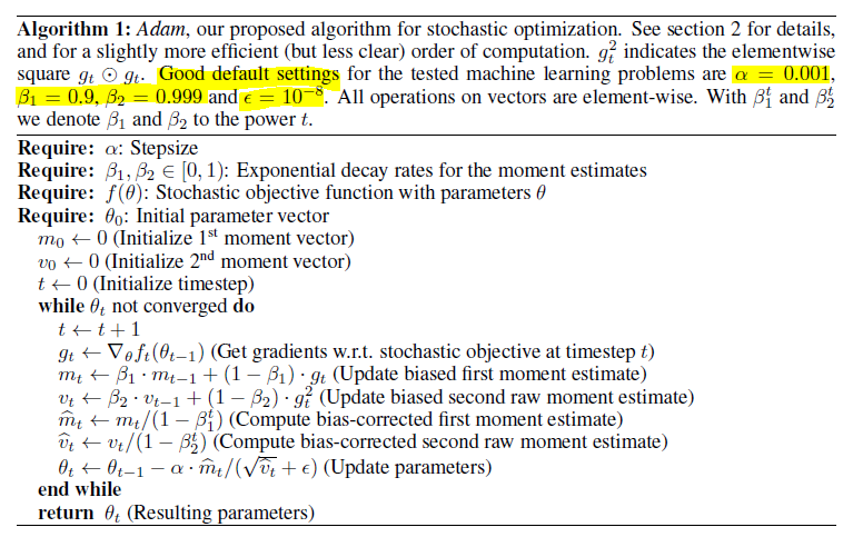 - adam의 hyper-parameter는 직관적이며 tuning이 거의 필요 없다.