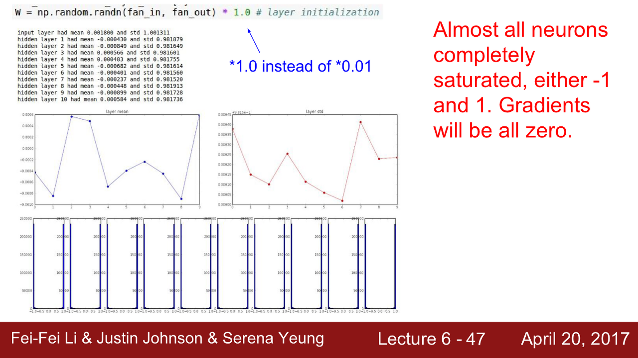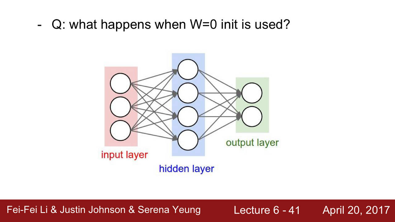 - 모든 뉴런이 "같은일" 을 한다. 가중치가 0이기 때문에 모든 뉴런은 모두 다 같은 연산을 한다. 같은 연산을 하기 때문에 gradient도 같을 것이고 모든 뉴런이 똑같이 업데이트가 될 것이다. 역전파 가중치 업데이트 또한 동일하게 발생