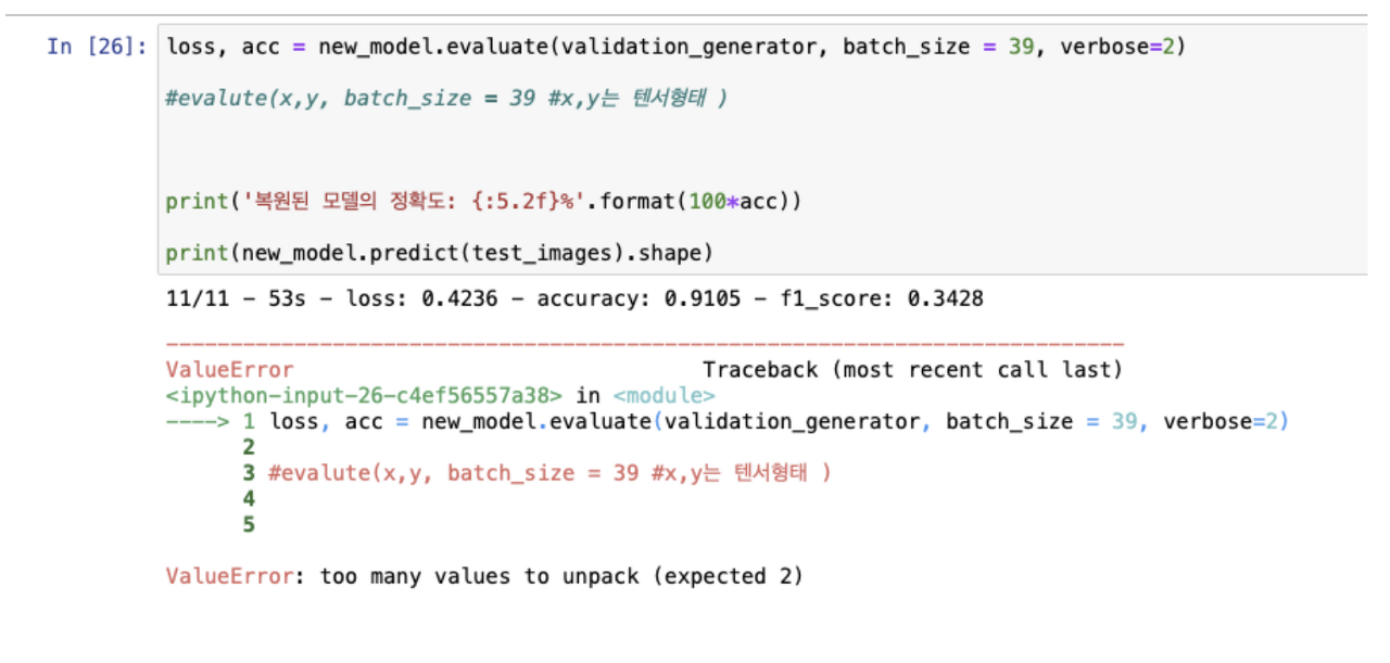 내 에러의 경우에는 값이 loss, accuracy, f1_score 까지 model.fit 에서 출력하도록 만들었기 때문에 loss, acc 두 개의 매개변수만 받았기 때문에 총 3개의 매개변수를 지정해서 값을 출력하여 주면 에러가 없어질 것이다