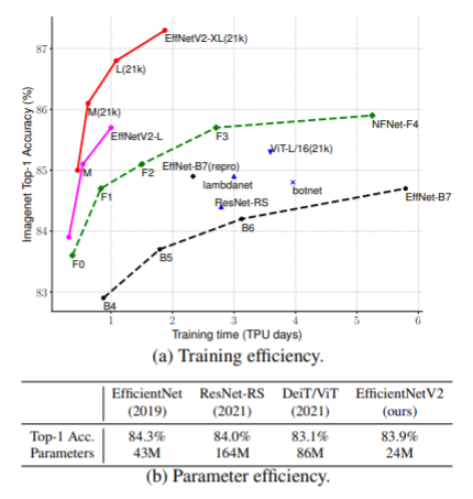 EfficientnetV2, Smaller Models and Faster Training 빠른 학습에 집중한 모델이다. EfficientNetV2의 파라미터 수를 비교했을때에 월등히 파라미터의 수가 적고, 이는 그만큼 효율적인 모델임을 증명해주는 부분이다. 큰 이미지로 하면 학습속도가 느림 / 초기 layer에서 depthwise convolution / 모든 stage를 동일한 비율로 scaling하는 것이 최적의 방법이 아님. 그래서 소개한 전략 1. progressive learning 2. fused-MBC convolution 3. Non-uniform Scaling 이 중에서 Progressive learning에 대해서 살펴보면 :Progressive Learning 이란 트레이닝 할때 이..