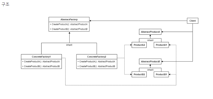 비슷한 기능을 하지만 종류가 다른 클래스들을 생성하는 인터페이스 제공 ▷ 첫 번째, 추상 제품 인터페이스(추상클래스도 가능) : 제품에 대한 추상적 인터페이스 제공 ▷ 두 번째, 구현 제품 클래스 : 팩토리가 생성할 구체적인 제품 ▷ 세 번째, 추상 팩토리 인터페이스(추상클래스도 가능) : 추상 제품을 생산하는 인터페이스 제공 ▷ 네 번째, 구현 팩토리 클래스 : 구현된 제품을 생산하는 방법 구현 기타 공장에서 통기타, 일렉기타 등 여러 종류의 기타를 만든다고 했을 때 [추상 제품 인터페이스] // 기타의 몸통을 뜻하는 추상 제품 인터페이스 public interface IBody { ... } // 기타의 현을 뜻하는 추상 제품 인터페이스 public interface IString { ... } 기타..